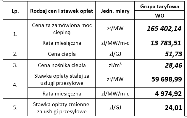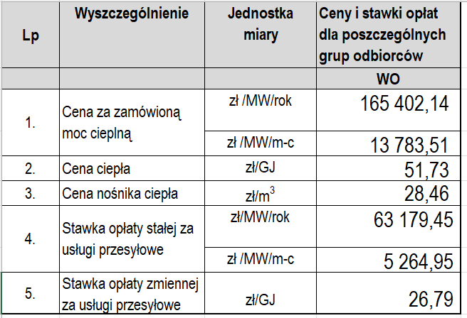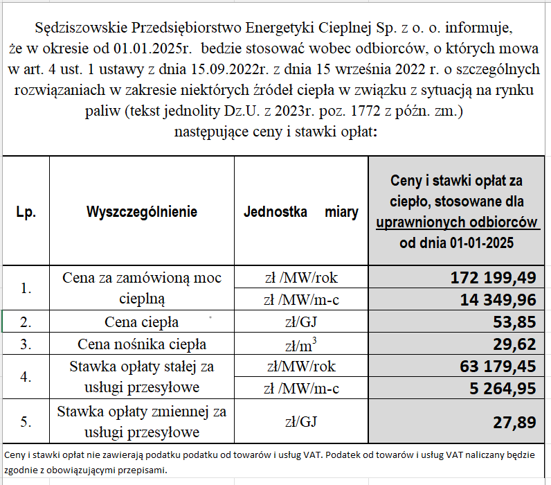 Działając na podstawie art. 59 a ust. 1 ustawy z dnia 15 września 2022 r. o szczególnych rozwiązaniach w zakresie niektórych źródeł ciepła w związku z sytuacją na rynku paliw (tekst jednolity Dz.U. z 2023r. poz. 1772 z późn. zm.) Sędziszowskie Przedsiębiorstwo Energetyki Cieplnej Sp. z o.o. informuje, że od dnia 01-01-2025 roku będzie stosować względem uprawnionych odbiorów ciepła następujące ceny i stawki opłat.