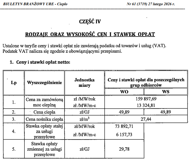 Działając na podstawie art. 59 a ust. 1 ustawy z dnia 15 września 2022 r. o szczególnych rozwiązaniach w zakresie niektórych źródeł ciepła w związku z sytuacją na rynku paliw (tekst jednolity Dz.U. z 2023r. poz. 1772 z późn. zm.) Sędziszowskie Przedsiębiorstwo Energetyki Cieplnej Sp. z o.o. informuje, że od dnia 01-04-2026 roku będzie stosować względem uprawnionych odbiorów ciepła następujące ceny i stawki opłat.